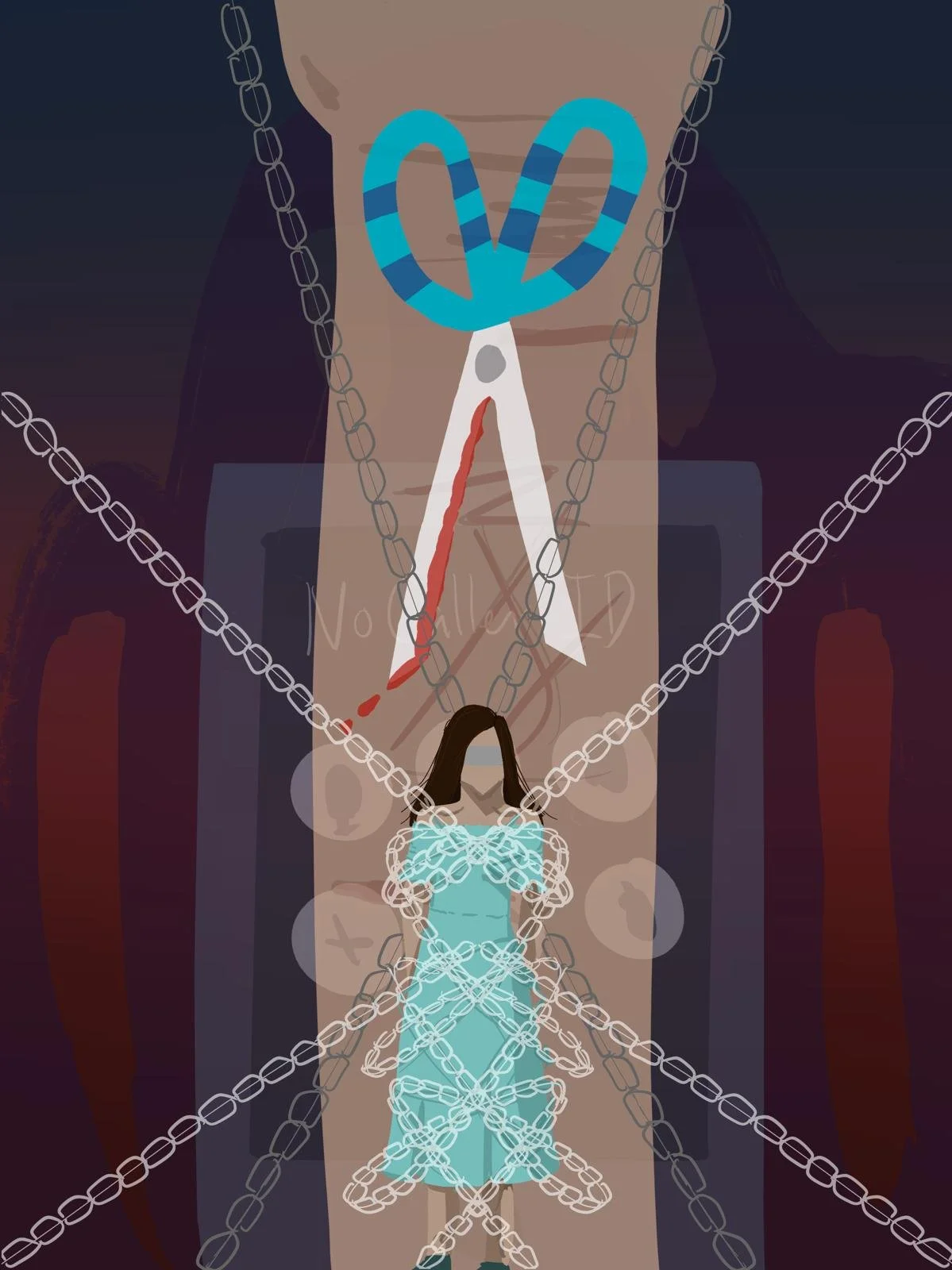 「上課的時候曾接觸到和我自己相似經歷的案例,當下更要深入探討和分析此議題,腦中便不停閃過不同的畫面。當中的畫面有關於事件本身的,有曾經因為事件做過的傻事,有我當時的狀態與感受。一下子一大堆畫面浮現實在難以承受,便把那些畫面都畫在同一幅畫中。」