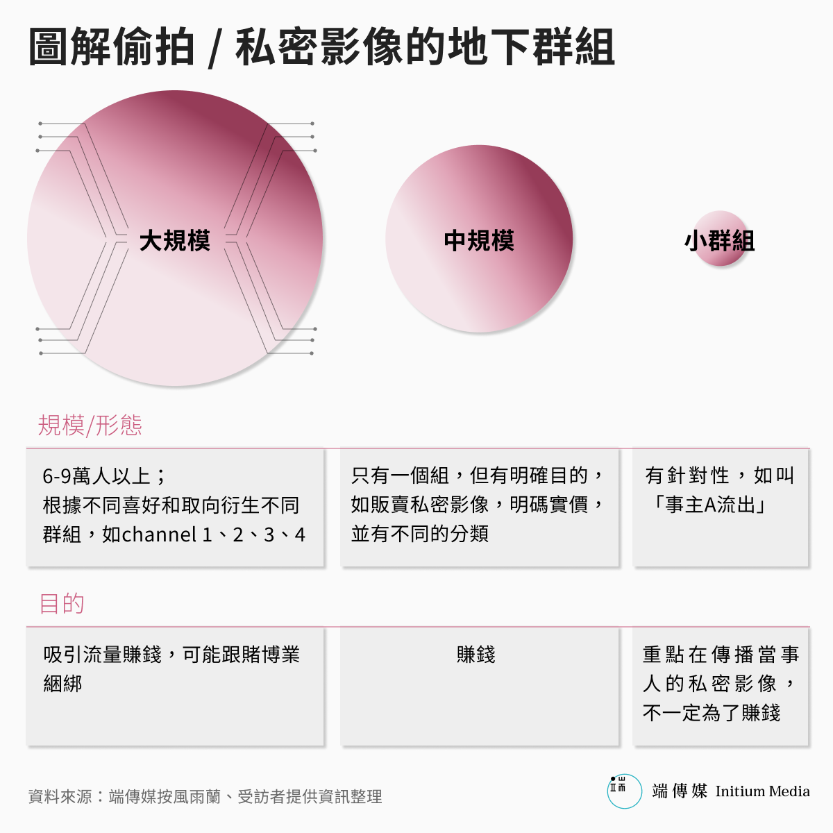 根據觀察,Blue 將這類群組分為三種類型:規模最大的可能有6-9萬人以上,並且會生出子 channel,這類群組主要為吸引流量,再用流量賺錢;中規模的群組可能只有一個組,但有明確目的,比如有些是賣私密影像,明碼實價,並有不同的分類(catalog);還有一種更小的群組、有明顯的針對性,為傳播某個當事人的私密影像,而不一定是為了賺錢:「比如開一個叫『事主 A 流出』的群組,然後把 link 放在連登上,讓人點進去看。」