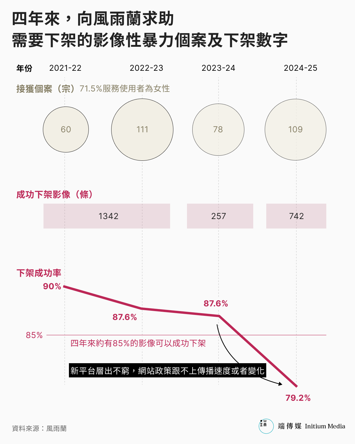 僅僅是過去一年,Blue 自己就檢舉了將近1000個link。2023-2024年,風雨蘭接獲78個下架個案,成功下架了257條連結,2024-2025年接獲109個個案,成功下架了712條。四年來,有大概85%的影像可以下架,但分拆到每一年,「數字不斷下降,2021-2022年是90%,2024-2025年只有79.2%。」原因是新平台層出不窮,網站政策跟不上傳播速度或者變化。