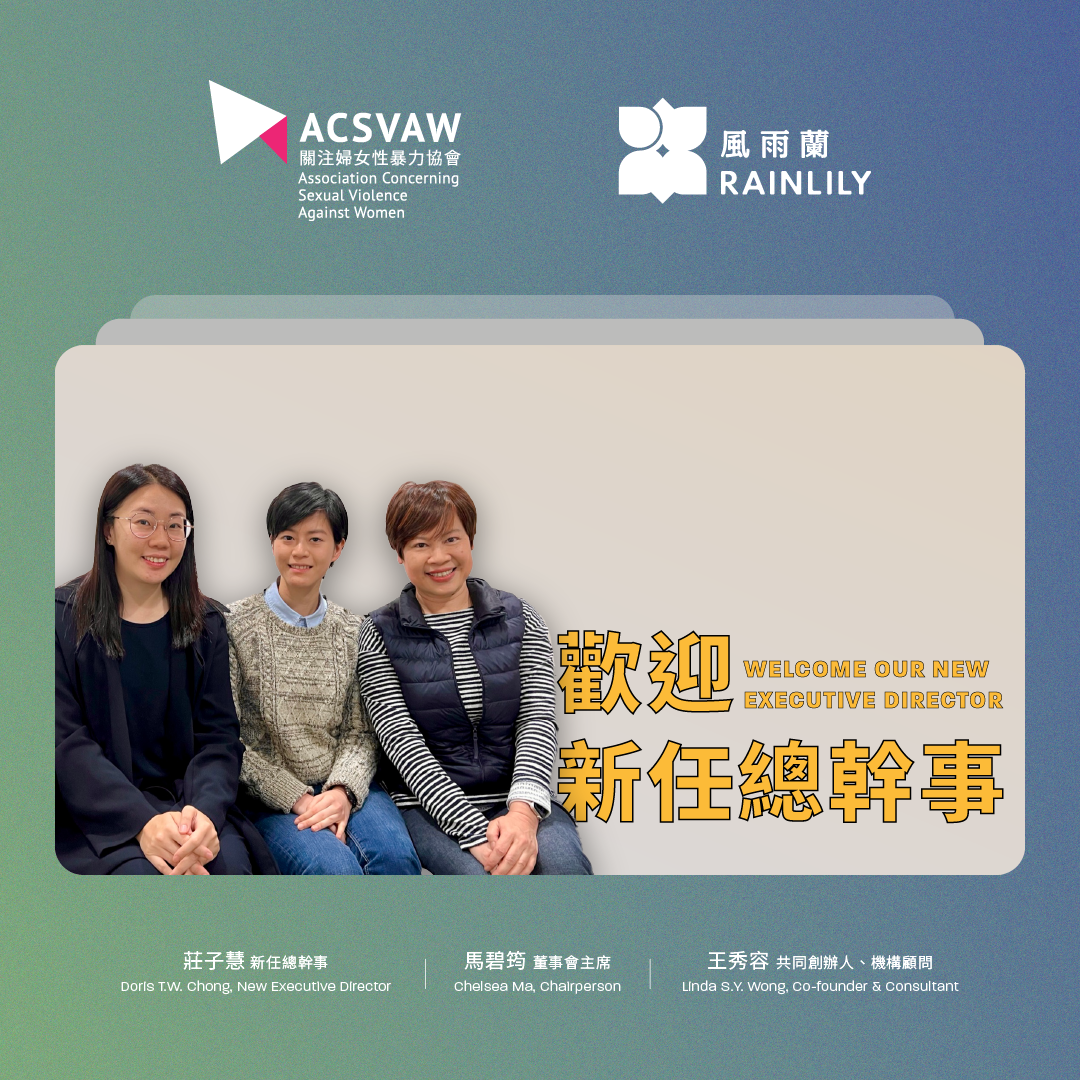 The Association Concerning Sexual Violence Against Women (the Association) and RainLily announce Doris Chong Tsz-Wai as the new Executive Director. Doris will lead the organisations in her new position from 1 March 2023. Linda Wong Sau-Yung, the co-founder of the Association and the long-serving Executive Director of the Association and RainLily, will take up a new role as the organisations’ Consultant.